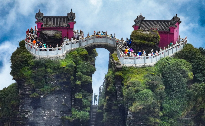 Today’s program includes a visit to Tianmen Mountain. A long cable car ride carries visitors to the summit, offering wide views across forests and cliffs.